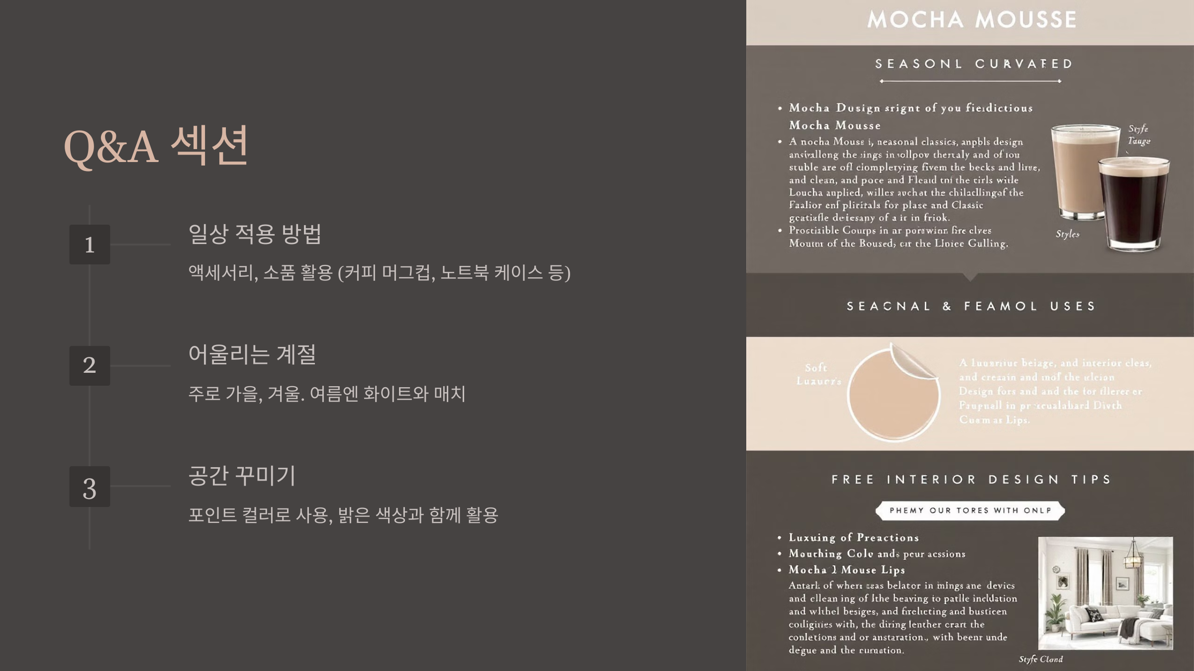 Q3: 모카 무스 컬러로 공간을 꾸미고 싶은데, 너무 어둡지 않을까요?