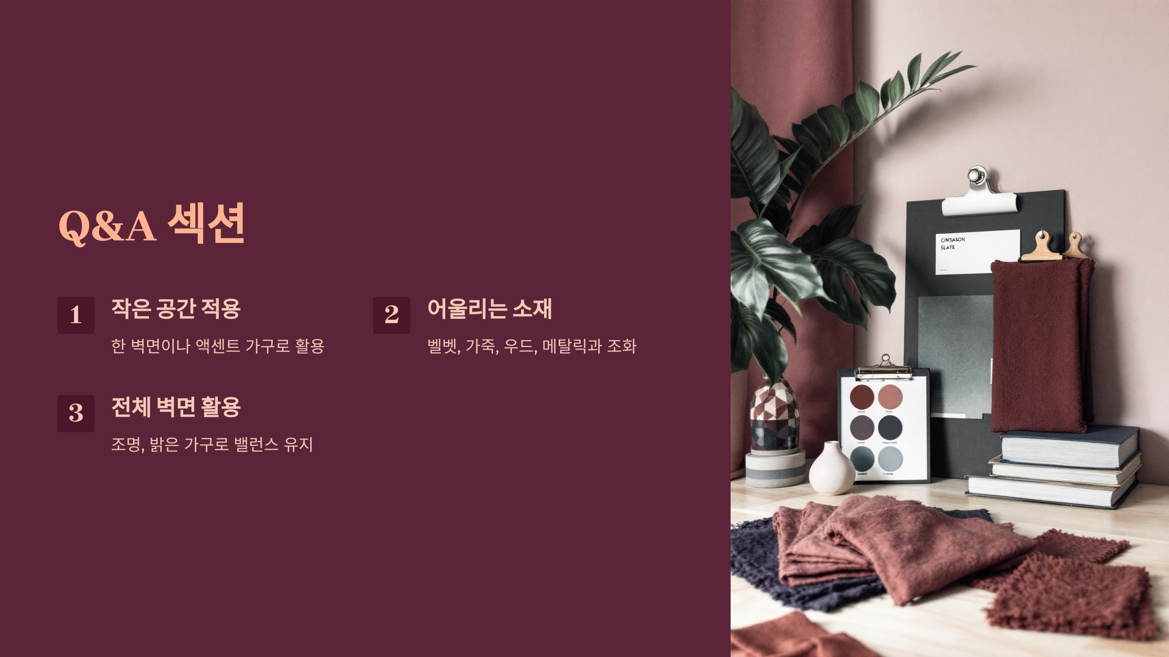 A3: 걱정하지 마세요. 시나몬 슬레이트는 생각보다 versatile한 색상입니다. 전체 벽면에 적용해도 충분히 아름답지만, 조명이나 밝은 색상의 가구, 액세서리를 활용하여 밸런스를 맞추면 더욱 멋진 공간을 연출할 수 있습니다. 또한, 자연광이 잘 들어오는 공간이라면 더욱 효과적일 거예요.