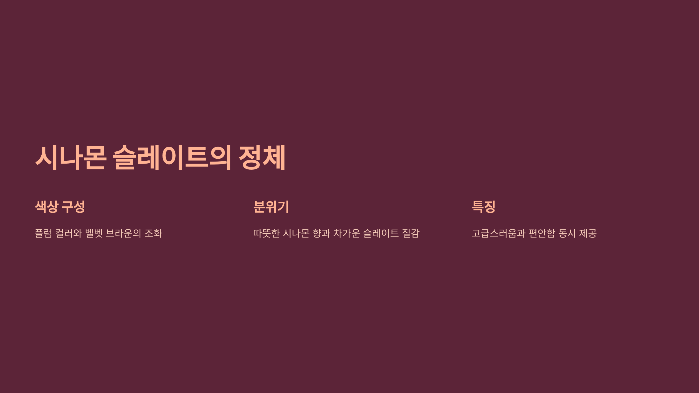 시나몬 슬레이트는 오묘하고 깊은 플럼 컬러와 벨벳 같은 브라운의 조화로 탄생한 색상입니다. 따뜻한 시나몬의 향과 차가운 슬레이트의 질감이 만나 독특한 분위기를 자아냅니다. 이 색상은 고급스러움과 편안함을 동시에 선사하며, 다양한 공간에 적용할 수 있는 versatile 한 매력을 지니고 있습니다.