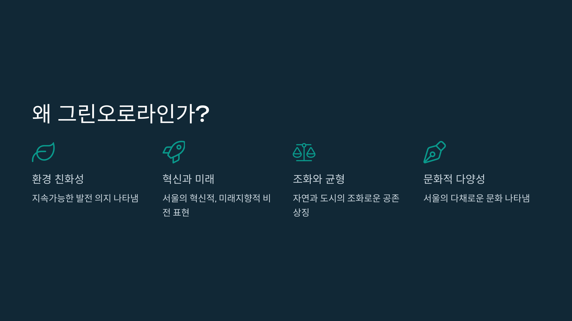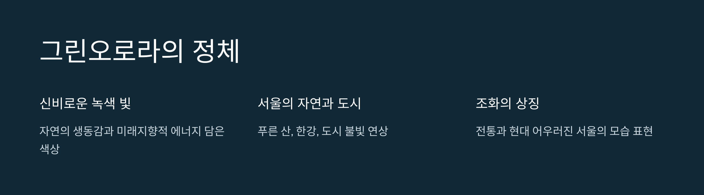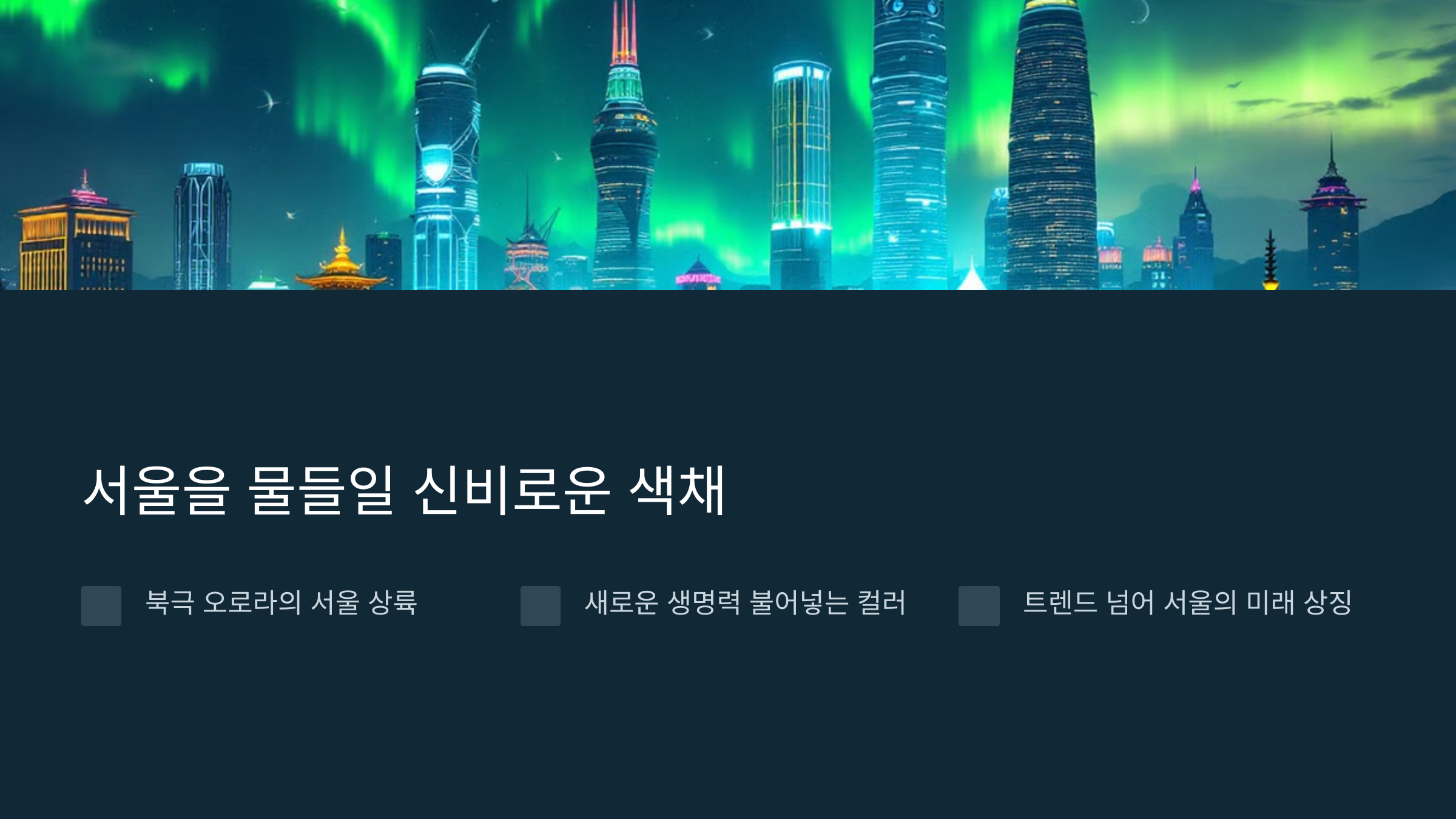 • 혁신과 미래: 오로라의 신비로운 이미지는 서울의 혁신적이고 미래지향적인 비전을 표현합니다.