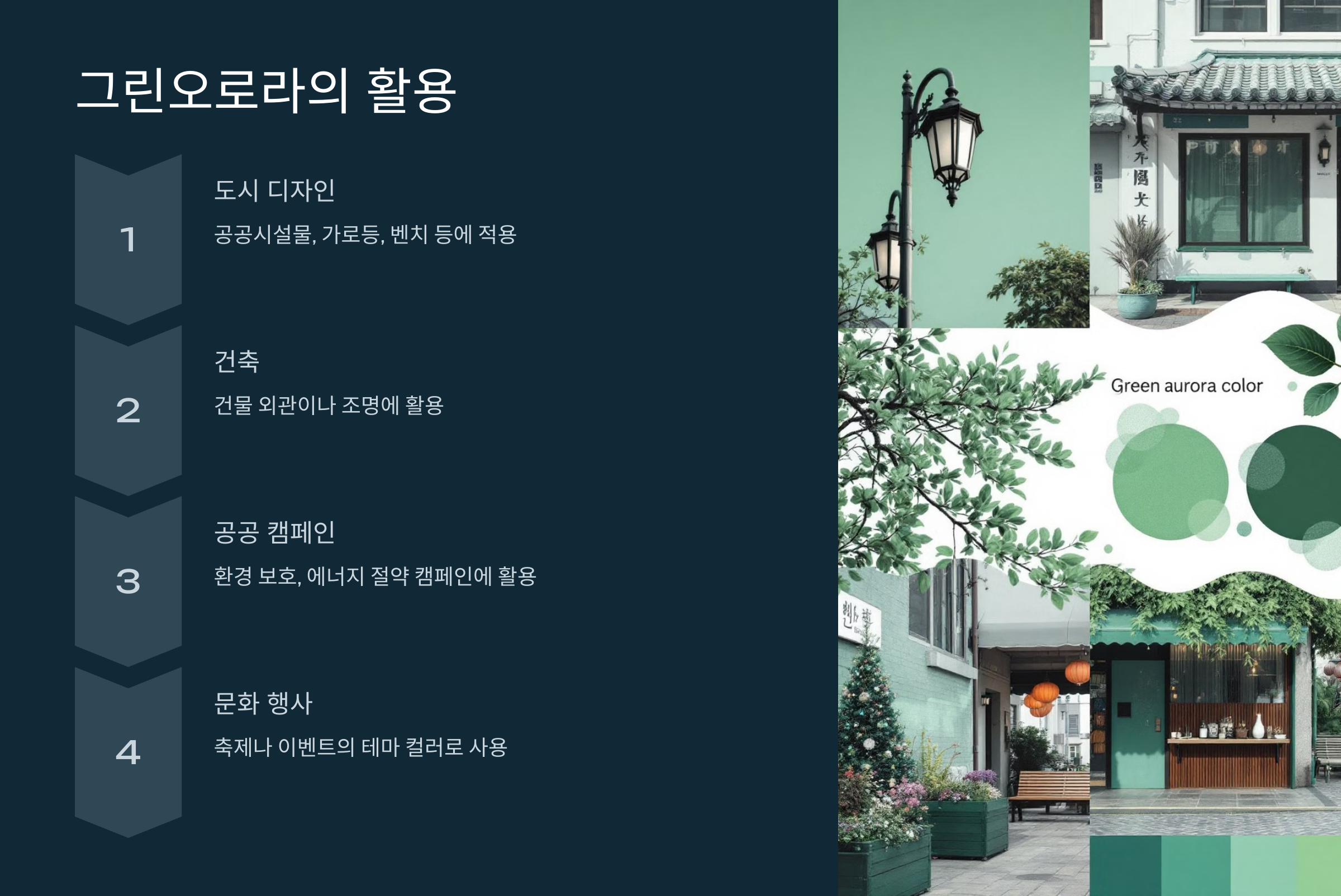 A3: 그린오로라는 환경 보호와 지속가능한 발전이라는 메시지를 담고 있어요. 이 컬러를 통해 시민들이 일상에서 환경에 대해 더 많이 생각하고, 작은 실천들을 해나가는 계기가 될 수 있을 거예요. 또한, 도시 경관이 변화함에 따라 시민들의 삶의 질 향상에도 기여할 수 있습니다.