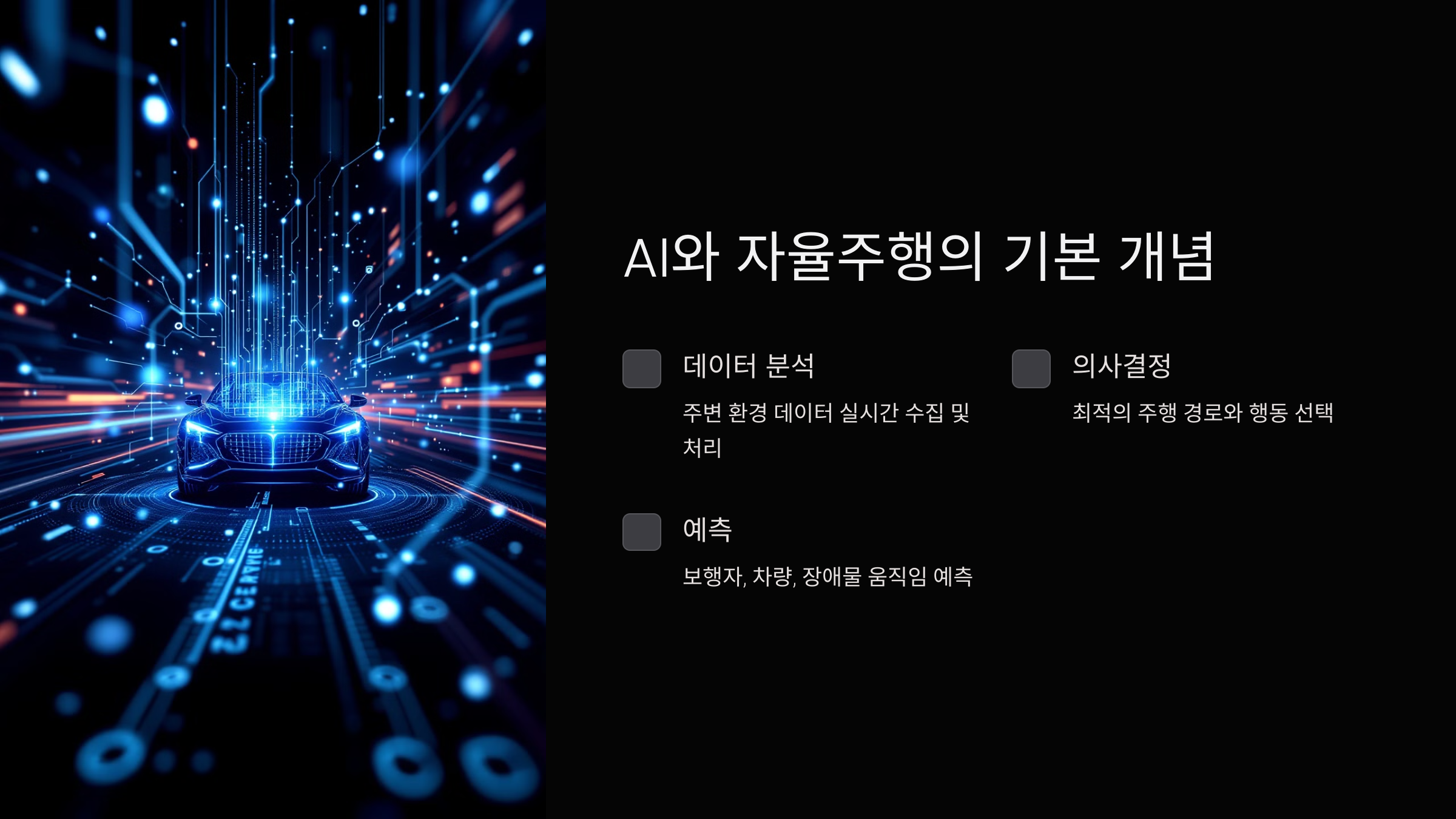 • AI의 역할: 이 데이터를 조합해 장애물을 피하거나, 차선을 변경하는 등 주행을 제어.