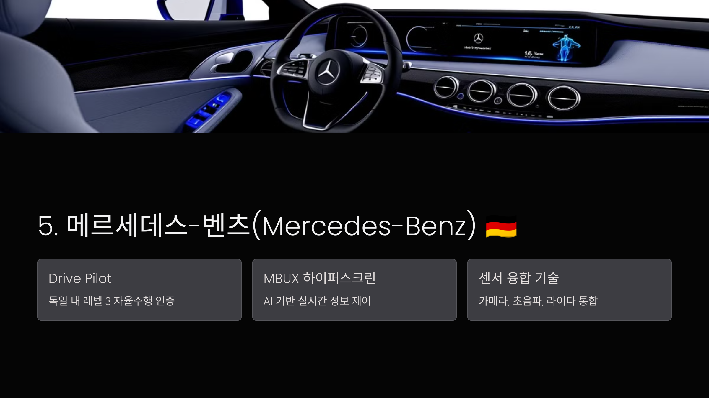 • Drive Pilot: 독일 내 레벨 3 자율주행 인증을 받은 최초의 시스템.