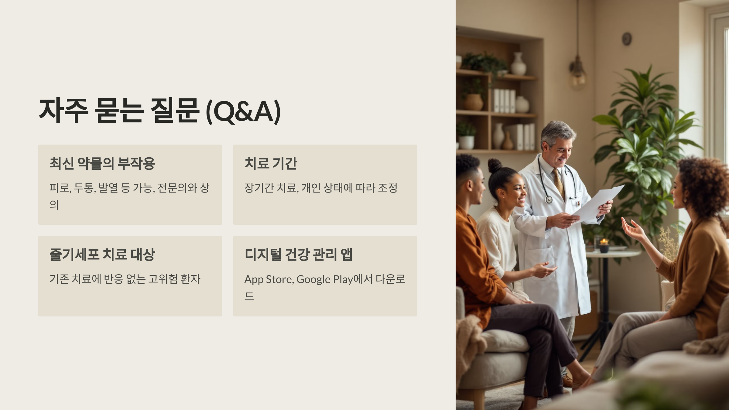 A1. 최신 약물도 피로, 두통, 발열, 감염 위험 증가 등 부작용이 있을 수 있습니다. 약물 사용 전 전문의와 충분히 상의하세요.