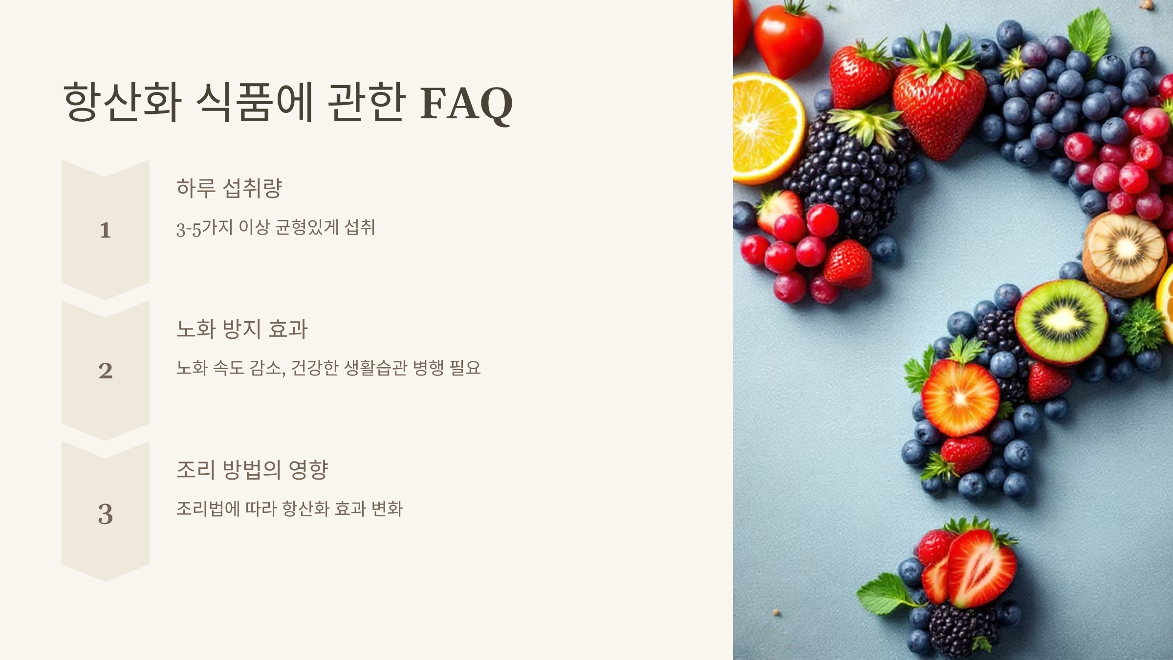 A: 항산화 식품은 하루 3~5가지 이상을 균형 있게 섭취하는 것이 좋습니다. 다양한 종류를 골고루 드세요!