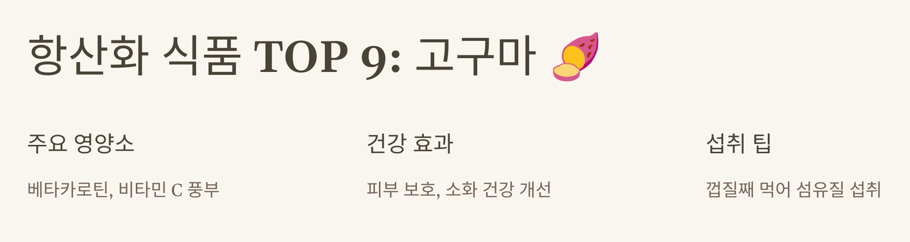 고구마는 베타카로틴비타민 C가 풍부한 항산화 식품으로, 체내 염증을 억제하고 면역력을 강화하는 데 효과적입니다.