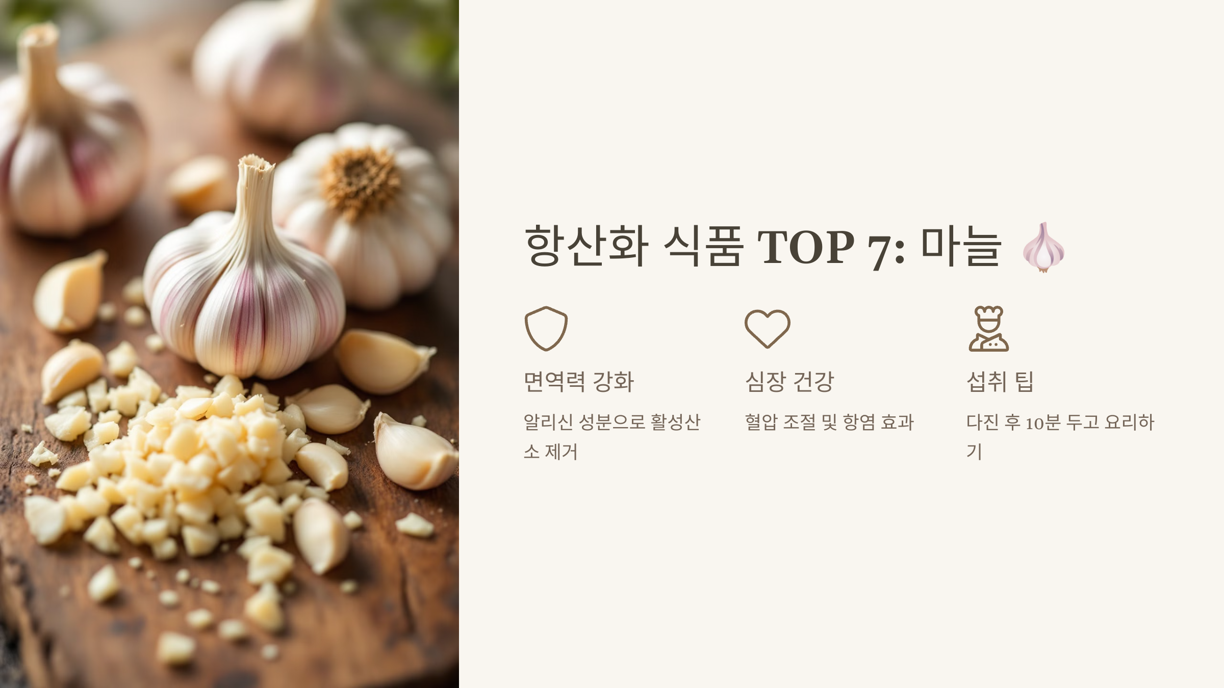 마늘에는 강력한 항산화 성분인 알리신이 들어 있어 체내 활성산소를 제거하는 데 효과적입니다. 또한 면역력을 높이고 심장 건강에도 긍정적인 영향을 줍니다.