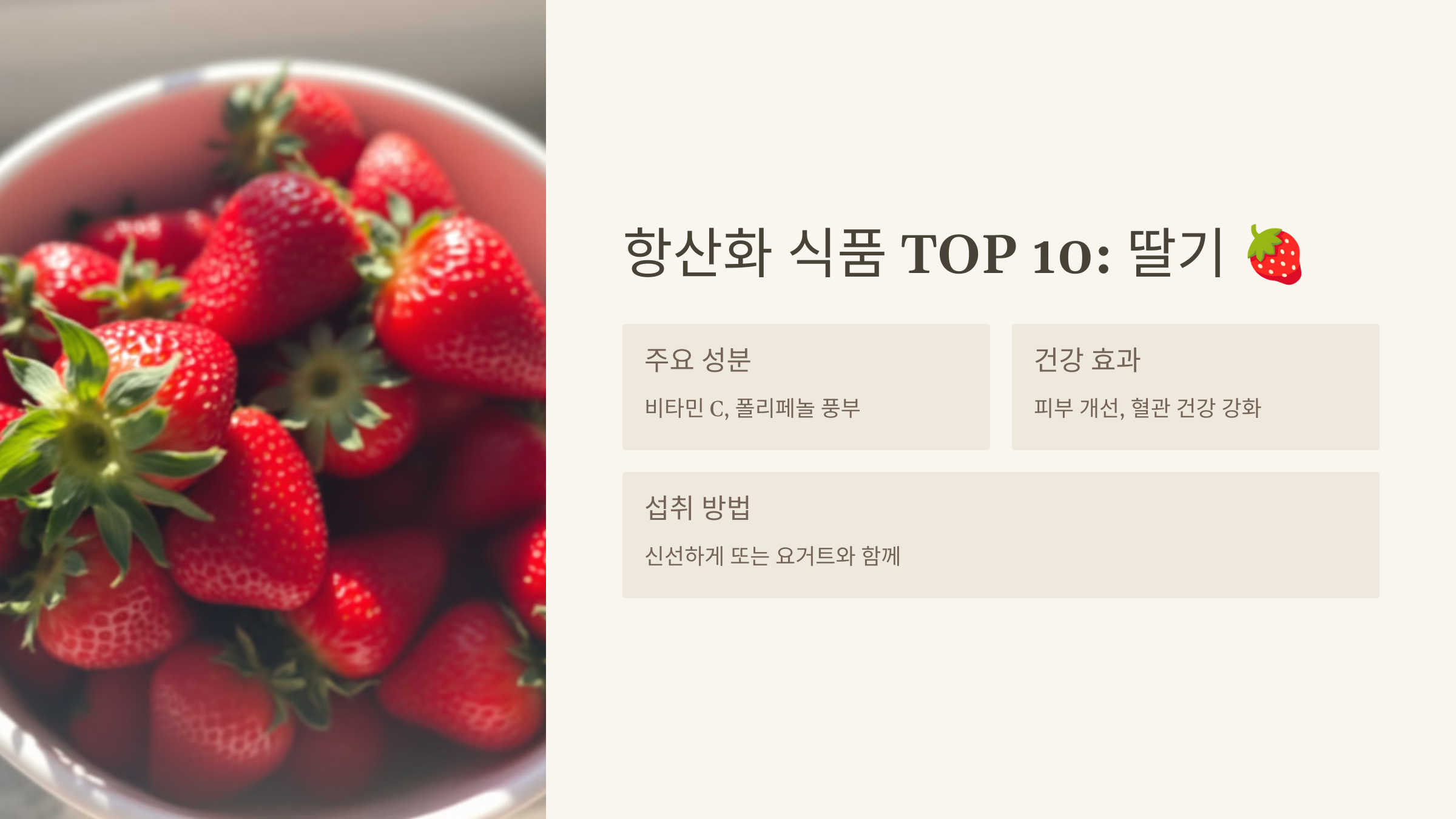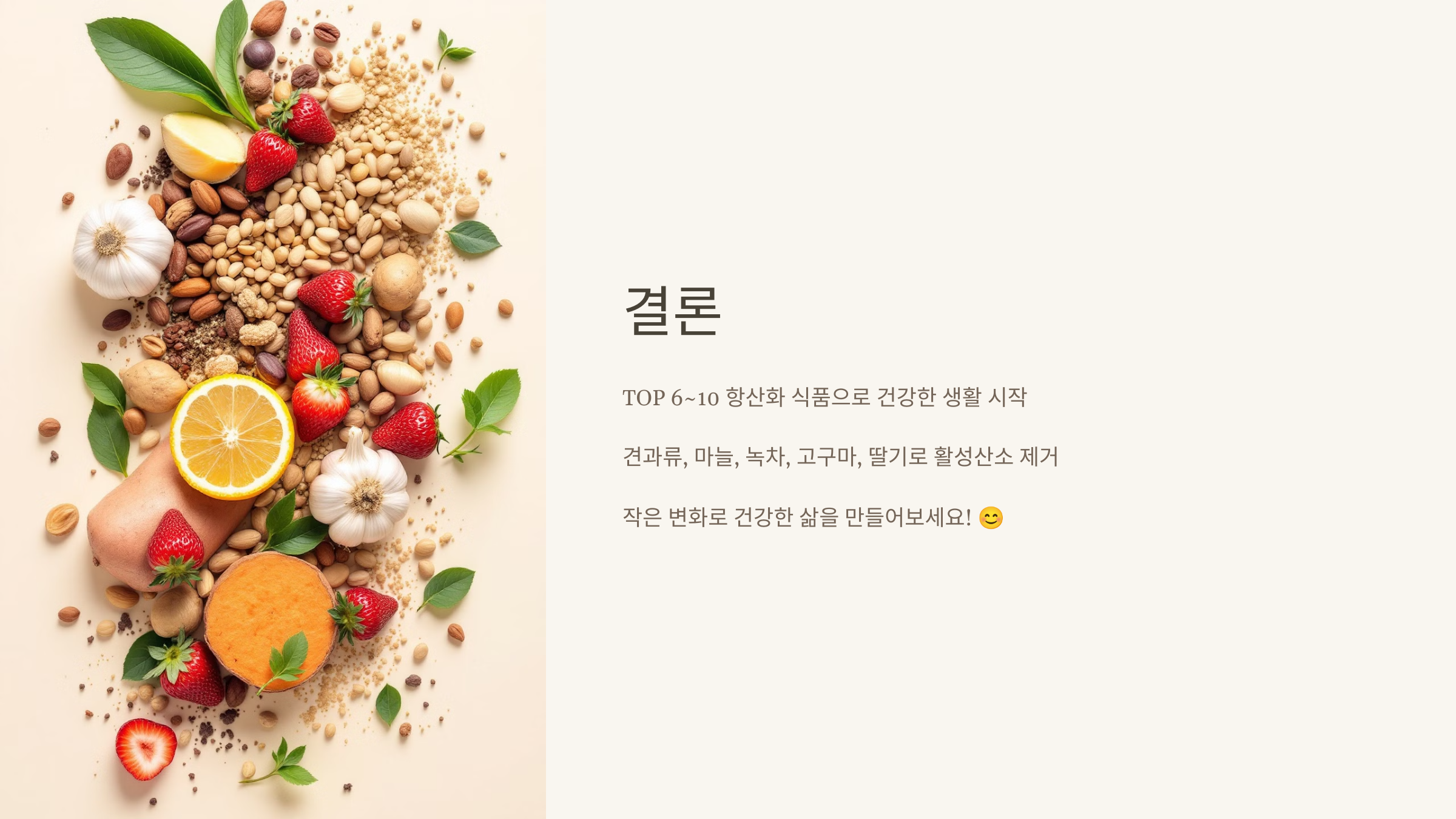 항산화 식품 TOP 6~10은 이미 소개된 TOP 5 식품에 더해 우리의 건강을 더욱 풍요롭게 만들어 줄 중요한 재료들입니다. 견과류, 마늘, 녹차, 고구마, 딸기를 식단에 포함해 활성산소를 효과적으로 제거하고 더 건강한 생활을 만들어 보세요. 작은 변화로 건강한 삶을 시작하세요! 😊