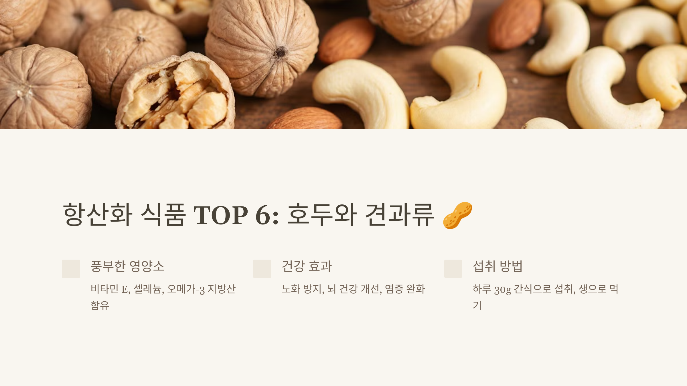 👉 Tip: 견과류는 볶지 않고 생으로 먹는 것이 항산화 성분을 더 잘 유지할 수 있습니다!