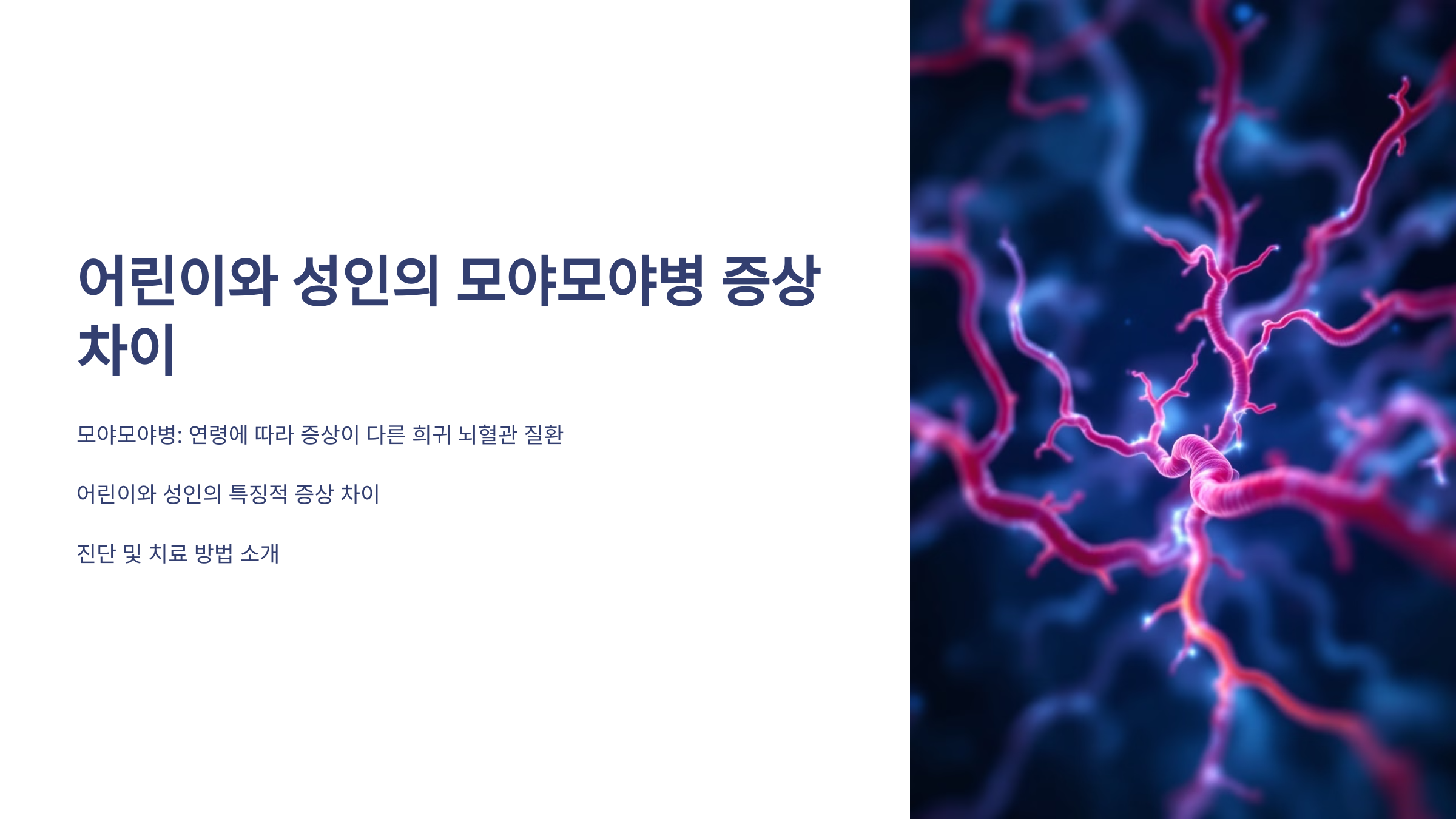 어린이와 성인의 모야모야병 증상 차이🧠 모야모야병, 연령에 따라 증상이 다르다?모야모야병(Moyamoya Disease)은 뇌혈관이 좁아지면서 혈류가 감소하는 희귀 뇌혈관 질환으로, 어린이와 성인 모두에게 발생할 수 있습니다. 하지만 어린이와 성인의 모야모야병 증상은 연령에 따라 큰 차이를 보입니다.오늘은 어린이와 성인에서 나타나는 모야모야병의 특징적인 증상 차이와 각각의 진단 및 치료 방법에 대해 자세히 알아보겠습니다. 🩺💡 모야모야병이란?모야모야병은 뇌로 가는 주요 혈관(내경동맥)이 점차 좁아지거나 막히면서 뇌혈류가 줄어드는 진행성 뇌혈관 질환입니다.일본어로 '모야모야(안개가 자욱한 모습)'에서 이름이 유래되었으며, 혈관 조영술로 촬영했을 때 협착된 주요 혈관 주변에 생긴 작은 혈관들이 마치 안..