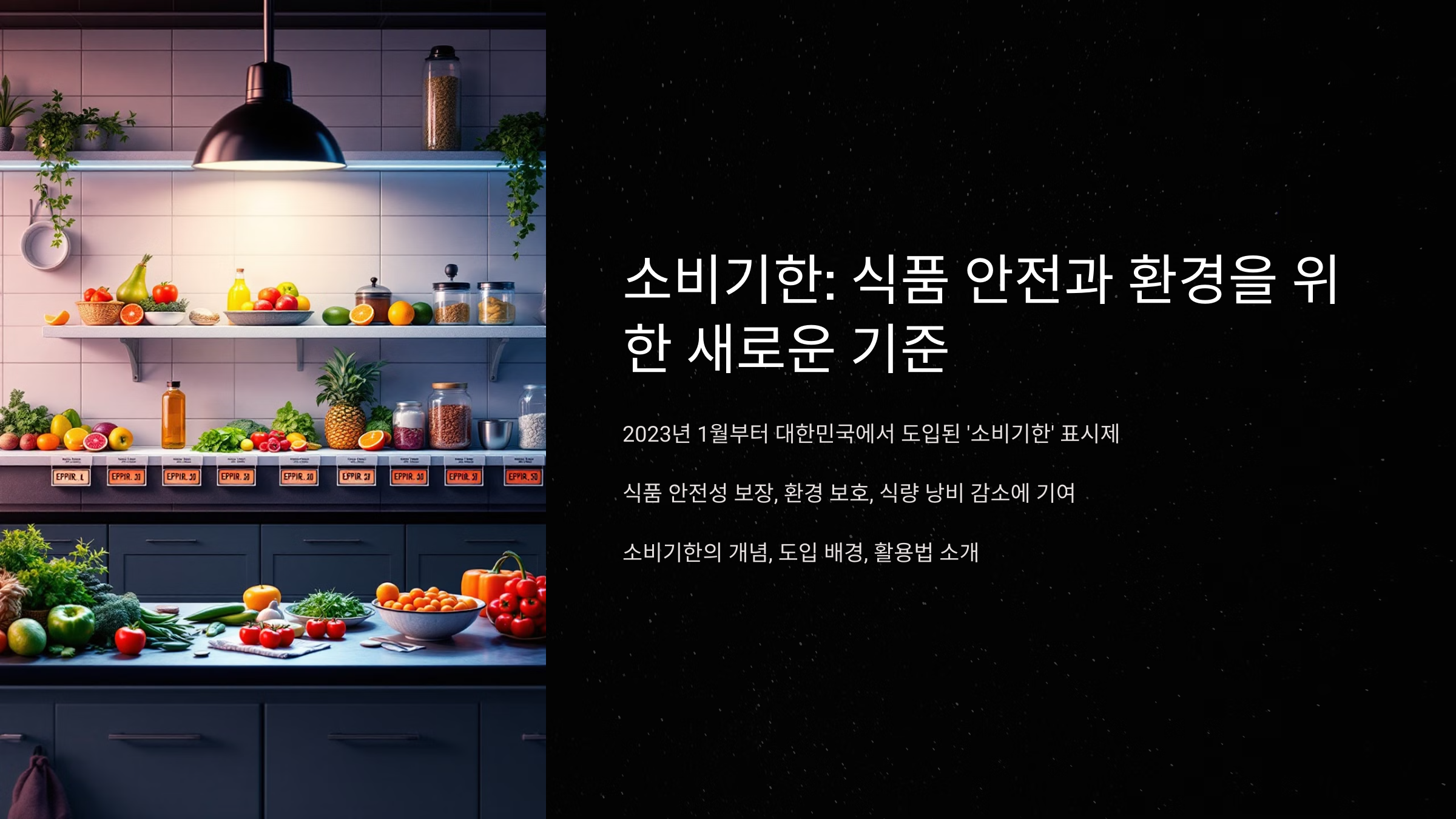 소비기한: 식품 안전과 환경을 위한 새로운 기준🍽️ 서론: 소비기한, 왜 중요한가?2023년 1월부터 대한민국에서는 기존의 '유통기한' 대신 '소비기한' 표시제가 도입되었습니다. 이 변화는 단순히 날짜 표시를 바꾸는 것이 아니라, 식품 소비와 보관에 대한 우리의 인식을 새롭게 하는 계기가 되고 있습니다. 소비기한은 식품 안전성을 보장하면서도 환경 보호와 식량 낭비를 줄이는 데 중요한 역할을 합니다. 이번 글에서는 소비기한의 개념과 도입 배경, 그리고 이를 활용하는 방법에 대해 알아보겠습니다.본론: 소비기한에 대한 모든 것1. 소비기한과 유통기한, 무엇이 다른가?소비기한과 유통기한은 비슷해 보이지만, 그 의미와 목적에서 큰 차이가 있습니다.유통기한: 제조일로부터 제품이 판매 가능한 기한을 뜻하며, 이 기..